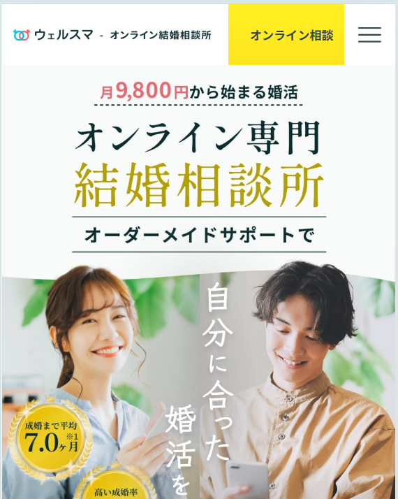 ウェルスマ | ![]() 老舗のオンライン結婚相談所!料金重視の人に | ![]() 初回来店だけでオンライン活動OK!信頼の大手を選びたい人に |